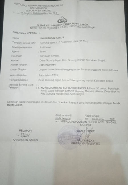 Sebelumnya,diduga gelapkan dana dan menipu ,oknum Guru SMK 1 Gunung Meriah ini dilaporkan ke polres Aceh Singkil,dengan tanda bukti laporan Nomor:SKTBL/59/XII/RES.1.8./ 2021/SPKT/Res Aceh singkil.